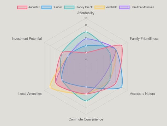 Ancaster is frequently cited as one of the best suburbs for families due to its excellent schools, numerous parks, community events, and safe environment. Dundas and parts of Stoney Creek and Hamilton Mountain also offer strong family-friendly amenities and good schools.