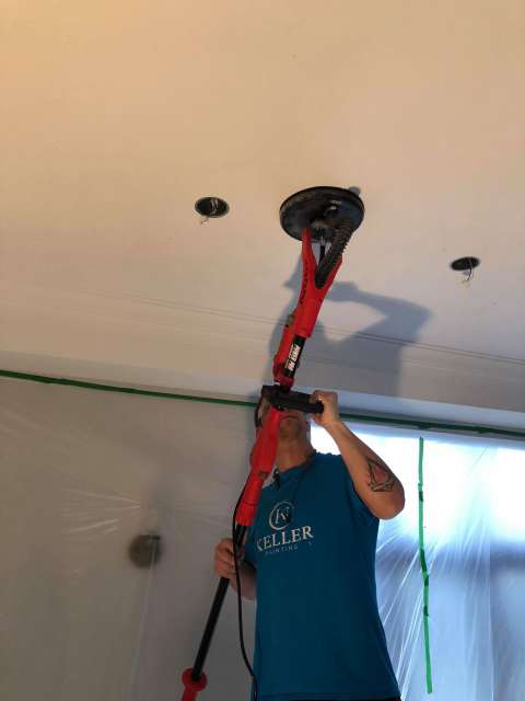 We smooth the ceiling surface and repair any imperfections, preparing it for a fresh, modern coat of paint.